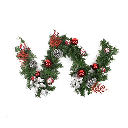 6′ Pre-Decorated Red and Silver Holly, Ball, Cedar and Pine Cone Artificial Christmas Garland – Unlit