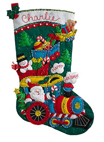 Create an 18″ felt Christmas stocking featuring Santa as conductor of a train full of toys, presents, candy, and a snowman. Bucilla felt stockings are great gifts that are treasured by those who receive them. Product Features 18″ Choo Choo Santa Bucilla felt stocking kit Kit includes pre-stamped felt, sequins, beads, needles, floss, and instructions