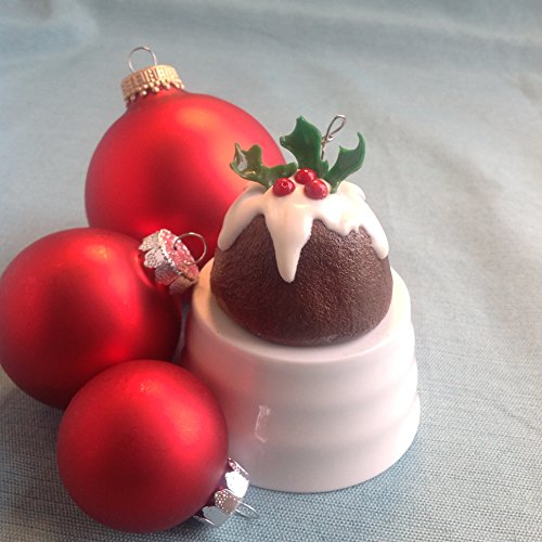 2 inches (5 cm) by 2 inches (5 cm ) tall, polymer clay, Figgy Pudding Christmas ornament. What dessert is more Christmas than Figgy Pudding. Each little cake is handmade, down to the tiny leaves on top. These sweet looking ornaments are sure to make any Christmas tree merry. There is nothing edible about this