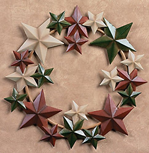 This decorative metal star wreath will adorn any door, wall or even as a centerpiece. Product Features Metal Barn Stars 14 1/2 inches in diameter red, green and cream
