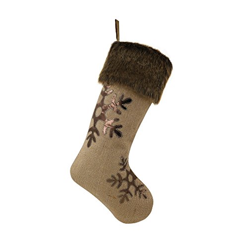 This Christmas stocking is golden and grey in color and is decorated with embroidery snowflake design and featured by dark grey faux fur cuff. With ready-to-hang loop, this woodland collection stocking will add a traditional and classic style to your holiday collection. Product Features Embroidery Snowflake Coordinate with Burlap in Good Shape Burlap with Silvery