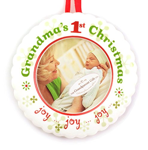 3.5 in round scalloped ceramic photo ornament with fun holiday art. Ornament reads: Grandma’s 1st Christmas, joy, joy, joy. 2 in space for photograph. Red ribbon for hanging. Clear Boxed. Product Features 3.5 in scalloped ceramic ornament Holds 2 in diameter photograph Reads: grandma’s 1st christmas, joy, joy, joy Red ribbon for hanging