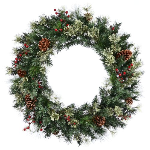 24″ Nisswa Berry Pine Artificial Christmas WreathItem #B114324This wreath features a mixture of rich two-toned perfectly molded PE tips and PVC tips accented with pine cones, and holly berries which creates a very realistic and full lookProduct Features :107 branch tipsUnlitHeavy duty double metal frame backing for hangingRecommended indoor use No assembly required, wreath comes