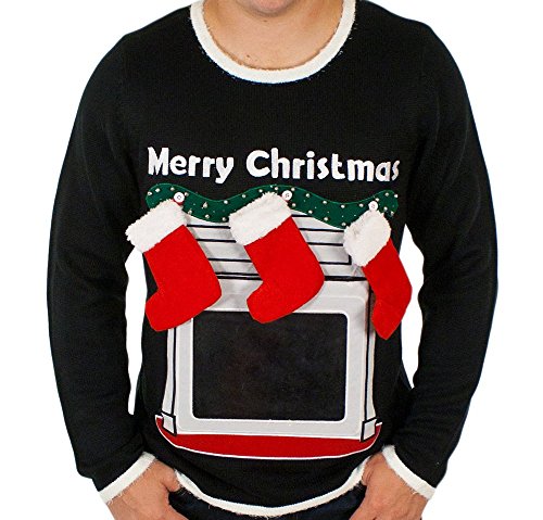 Our new and innovative Fireplace sweater features a clear plastic pouch for you to insert a tablet (iPad, Kindle Fire, Windows Surface, etc.) to play your favorite fireplace app. Pouch secures at the top via 3 snaps and measures 9-7/8 inches wide by 8 inches high. The garland on the mantle is also lit with