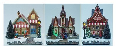 Battery Operated, LED Fiber Optic Village House, Assorted, 7.3″ To 9.1″ Height, Includes 2 Each Style: Toy Shop, Church & Candy Shop, Plays 7 Different Songs With Option Switch: Music/No Music, Injection Construction, Uses 3 “AA” Batteries, Included, 4 Color Open Try Me Packaging. Easily usable product. This product is manufactured in China. Product Features