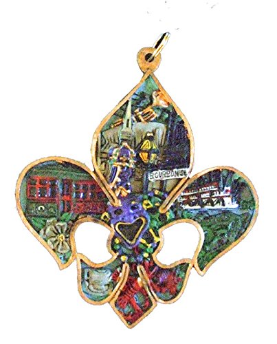 New Orleans-themed Fleur de Lis Holiday Ornament with Gold ribbon Loop – Ready to Hang Scenes include Mardi Gras Float, Streetcar, Café au Lait, Steamboat, Bourbon St, Crawfish, Alligator and more