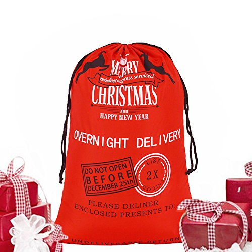 ============================ OUTSTANDING FEATURE ========================== ★The bag is a high quality product with Christmas designs. Stylish and Fashionable. ★Made of environmental protective Polyester-cotton. Safe to contact with skin or food. ★Bag is 20 Inch (w) x 28 Inch (h) inches and has a handy drawstring closure. ★You can personalize with handwriting or embroidery. ★Would it be
