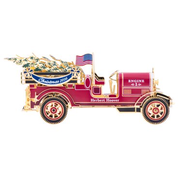 The 2016 White House Christmas ornament honors the administration of Herbert Hoover, who served as the thirty-first president of the United States from 1929 to 1933. It is inspired by the fire engines that responded to the 1929 Christmas Eve fire at the White House and the toy trucks presented to children by the Hoovers