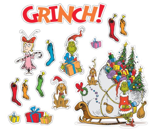 Dr. Seuss the Grinch Bulletin Product Features 4 panels of large Dr. Seuss characters from “The Cat in the Hat” panels are 17 to 24″ each Over 30 stocking cut-outs The Grinch, Cindy Lou-Who, Sled and Max Decorate classrooms, children’s bedrooms, play areas