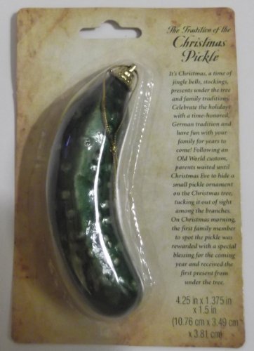 An Old World custom, parents hid a pickle ornament on the Christmas Tree on Christmas Eve, tucking it out of sight. The first family member to spot the pickle on Christmas Morning was rewarded with the first present from under the tree. Product Features pickle ornament with green glitter finish Measures 4 inches long The