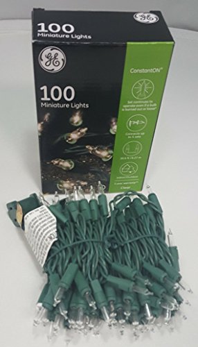 General Electric String-A-Long 100 light Constant ON Miniature Christmas Lights set has a 3-inch lead wire, 3-1/2-inch lamp spacing, a 3-inch end connector, a 20.6′ lighted length, 21.1′ total set length. Comes in a printed box. Green cord set with multi-colored, miniature bulbs. Product Features Clear bulbs Lighted Length : 20.6′ Total length : 21.7′